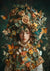 Dieses Gemälde zeigt eine Dame mit einem neutralen Ausdruck, gekleidet in eine aufwendige Kopfbedeckung und ein Kleidungsstück aus Blumen und Schmetterlingen. Das farbenfrohe Kopfschmuck mit gelben, rosa und grünen Tönen wird von Schmetterlingen in verschiedenen Größen und Farben umgeben.