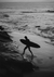 Ein schwarz-weißes Gemälde von jemandem mit einem Surfbrett, der aus dem Wasser kommt.