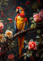 In diesem lebendigen Gemälde prangt ein bunter Papagei mit leuchtend gelben, roten und blauen Federn, der auf einem Ast sitzt. Der Papagei ist umgeben von lebhaften roten und rosa Blumen neben grünen Blättern, vor einem dunklen Hintergrund, der ihre Schönheit betont.