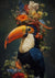 Dieses Gemälde zeigt ein stilisiertes Bild eines Tukan mit einem großen, lebendigen Schnabel, verziert mit einem aufwendigen Kopfschmuck aus verschiedenen bunten Blumen und Blättern vor einem dunklen Hintergrund.