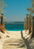 Ein Gemälde mit einem Sandweg zum klaren Wasser.